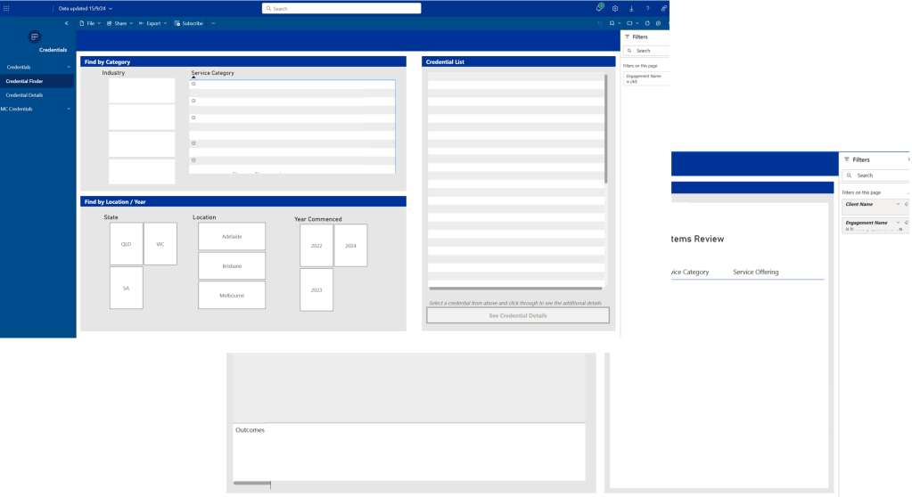 This Power BI dashboard was developed for a Big 4 consulting firm and was widely adopted by the national team. It streamlined the process of locating past project credentials, enabling consultants to efficiently retrieve relevant case studies and improving proposal development and client pitches. The success of the initial dashboard led to the creation of additional versions for more teams across the division.
