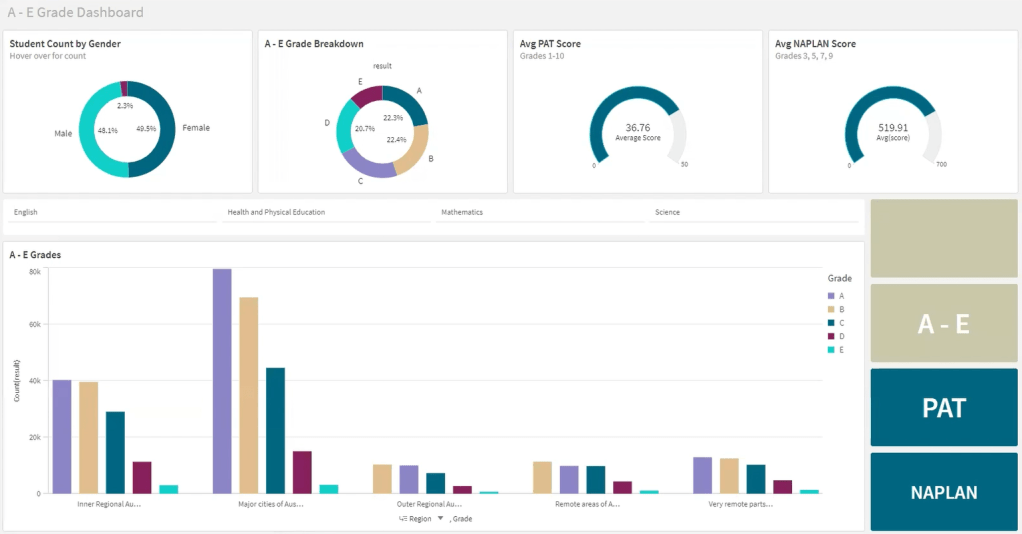 This Qlik dashboard is a proof of concept (POC) developed for the Department of Education, designed for multi-disciplinary use across various education and policy teams. It provides a comprehensive view of student performance, integrating A-E grade distributions, PAT scores, and NAPLAN results with demographic breakdowns.